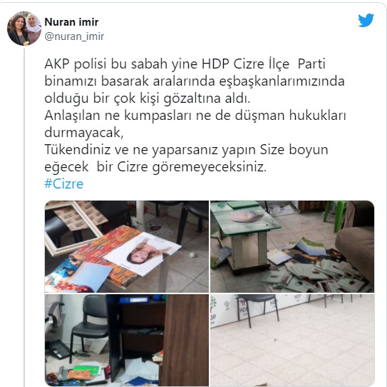 “AKP polisi bu sabah yine HDP Cizre İlçe Parti binamızı basarak aralarında eşbaşkanlarımızın da olduğu bir çok kişi gözaltına aldı.