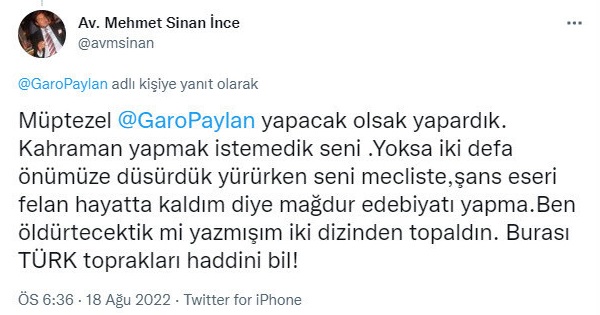Mehmet Sinan İnce, bugün sosyal medya hesabından “müptezel” dediği Garo Paylan’ı, “Yapacak olsak yapardık. Kahraman yapmak istemedik seni. Yoksa iki defa önümüze düşürdük yürürken seni Meclis’te” ifadeleriyle tehdit etti.