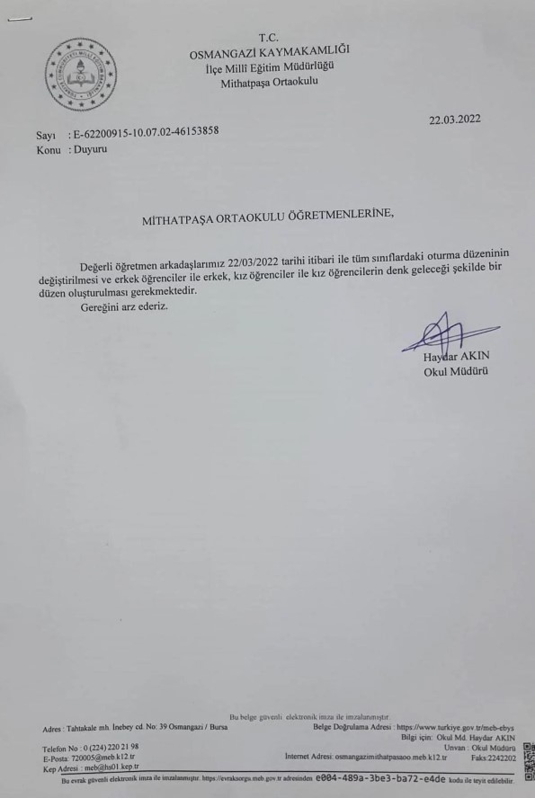 Akın’ın öğretmenlere gönderdiği mesaj ve 22.03.2022 tarihli resmi yazıda; “Değerli arkadaşlar sınıflarımızda kız ve erkek yan yana oturtulmuş bazı sınıfları görüyorum. Sınıf öğretmenlerimizin sınıflarda kesinlikle erkekleri erkeklerle kızları kızlarla oturtulması konusunda hassas davranmanızı özellikle rica ediyorum. Bu durumda olan sınıf öğretmenlerimizin en kısa zamanda gerekli değişiklikleri yapmalarını önemle rica ederim” yazmaktadır.