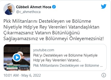Kişisel Twitter hesabından HDP'yi hedef aldığı videosunu paylaşan Cübbeli, "PKK militanlarını destekleyen ve bölünme niyetiyle HDP'ye rey verenleri vatandaşlıktan çıkarmazsanız vatanın bütünlüğünü sağlayamazsınız ve bölünmeyi önleyemezsiniz!" dedi.