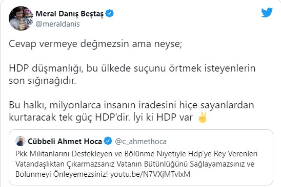 "Cevap vermeye değmezsin ama neyse; HDP düşmanlığı, bu ülkede suçunu örtmek isteyenlerin son sığınağıdır.