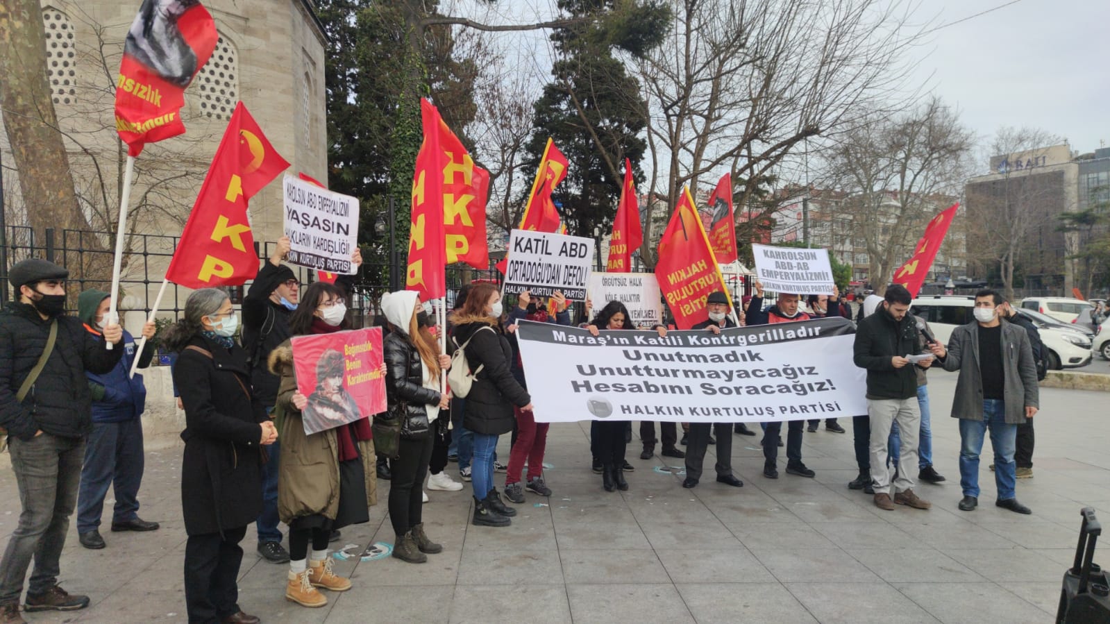 Tarih: 26-12-2021 18:39:04WELG - Halkın Kurtuluş Partisi (HKP) İstanbul İl Örgütü, Kahramanmaraş'ta çoğu Alevi yurttaşlardan oluşan 120 kişinin öldürüldüğü 19-26 Aralık 1978 katliamının 43'üncü yıldönümünde anma etkinliği düzenledi. Beşiktaş İskele Meydanı'nda bir araya gelen HKP Üyeleri, "Maraş'ın Katili Kontrgerilladır! Unutmadık, Unutturmayacağız, Hesabını Soracağız!" yazılı pankart açtı. Eylem sırasında "Maraş'ın Hesabı Sorulacak", "Maraş'ı Unutma, Unutturma" sloganları atıldı.