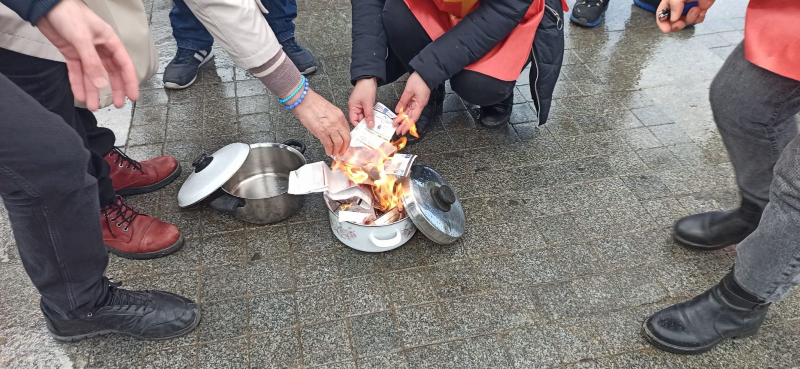Kızıltaş'ın ardından söz alan HKP üyesi, "Şimdi 500, 1000, 1500 liraları bulan elektrik, doğalgaz, su faturalarımızı burada bu zamları protesto etmek için yakıyoruz" diye konuştu.