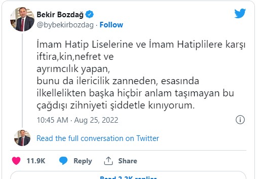 Adalet Bakanı ve HSK Başkanı Bekir Bozdağ, dün şarkıcı Gülşen’in imam hatip mensuplarına yönelik ifadelerine sosyal medyadan açıklama yapıp, “İmam hatip liselerine ve imam hatiplilere karşı iftira, kin, nefret ve ayrımcılık yapan, bunu da ilericilik zanneden, esasında ilkellikten başka hiçbir anlam taşımayan bu çağ dışı zihniyeti şiddetle kınıyorum. Sanatçı kisvesi adı altında kin, nefret ve ayrımcılık dili kullanarak halkın bir kesimini diğer kesimine karşı tahrik etmek, sanata ve sanatçılara da yapılmış saygısızlıktır. Hiç kimsenin halkımız arasında kin, nefret, düşmanlık ve ayrımcılık yapma hakkı ve hürriyeti yoktur” diye tepki göstermişti.