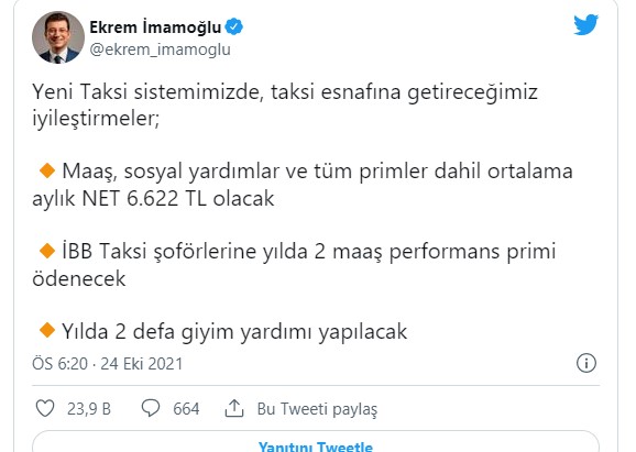WELG - İstanbul Büyükşehir Belediye (İBB) Başkanı Ekrem İmamoğlu, yeni taksi sistemiyle ilgili detayları Twitter hesabından paylaştı.