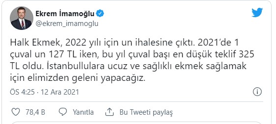 "Halk Ekmek, 2022 yılı için un ihalesine çıktı. 2021’de 1 çuval un 127 TL iken, bu yıl çuval başı en düşük teklif 325 TL oldu. İstanbullulara ucuz ve sağlıklı ekmek sağlamak için elimizden geleni yapacağız."