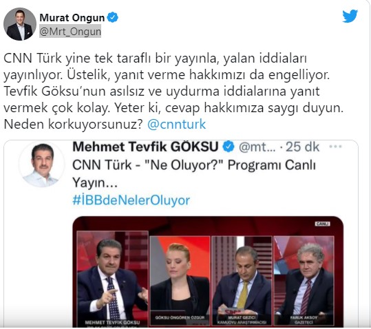 CNN Türk’ün gerçeklerden kaçtığını belirten Ongun kanalı etiketlediği bir başka paylaşımında, “Hamdolsun, bugün de İBB AK Parti Grup Başkanvekili ve hamisi CNN Türk televizyonu doğrulardan fellik fellik kaçtı. Cevap hakkımız yine engellendi. Korkmayın, doğrular iyidir” dedi.