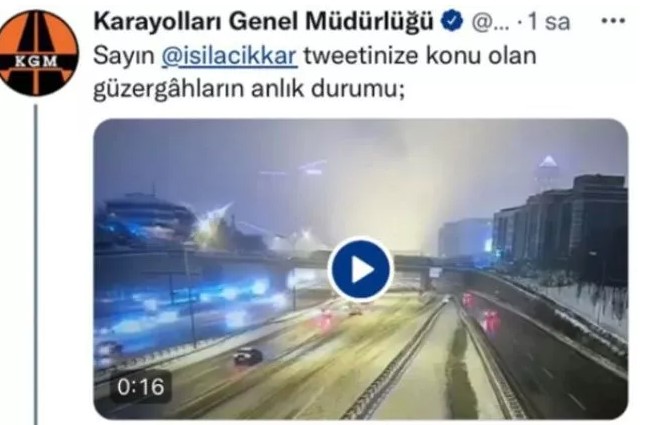 Açıkkar'ın paylaşımına yanıt veren Karayolları Genel Müdürlüğü, TRT spikerinin bulunduğu konumun canlı mobese görüntülerini paylaşımına ekledi.