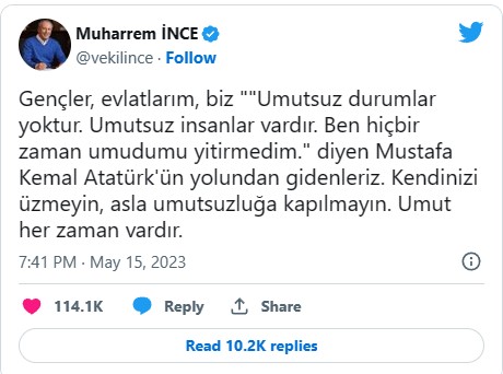 14 Mayıs'ta gerçekleşen cumhurbaşkanlığı ve 28. Dönem Milletvekilliği seçiminin ardından Memleket Partisi lideri Muharrem İnce, gençlere seslenerek "Kendinizi üzmeyin, asla umutsuzluğa kapılmayın. Umut her zaman vardır" dedi.