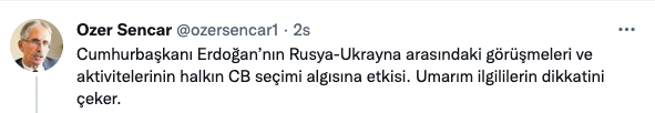 Metropoll Araştırma kurucusu Özer Sencar, araştırmanın sonuçlarını “Cumhurbaşkanı Erdoğan’nın Rusya-Ukrayna arasındaki görüşmeleri ve aktivitelerinin halkın Cumhurbaşkanlığı seçimi algısına etkisi. Umarım ilgililerin dikkatini çeker” notuyla paylaştı.