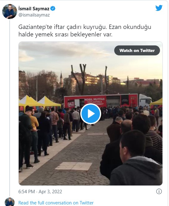 Sosyal medyada paylaşılan görüntülerde kuyruğun metrelerce uzadığı görüldü. Görüntüleri paylaşan gazeteci İsmail Saymaz, “Gaziantep’te iftar çadırı kuyruğu. Ezan okunduğu halde yemek sırası bekleyenler var” dedi.