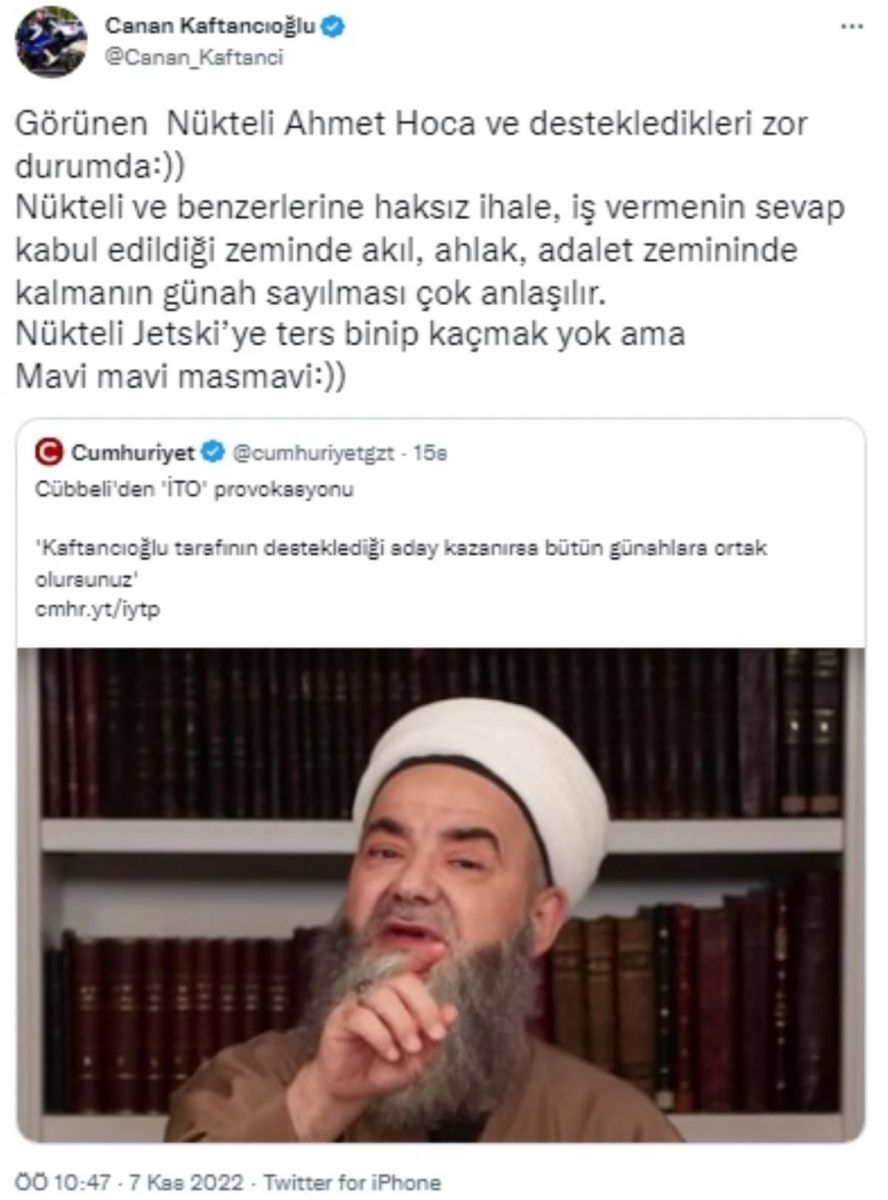 Ünlü için ‘Nükteli Ahmet Hoca’ diyen Kaftancıoğlu, “Nükteli ve benzerlerine haksız ihale, iş vermenin sevap kabul edildiği zeminde akıl, ahlak, adalet zemininde kalmanın günah sayılması çok anlaşılır” ifadeleri kullandı.