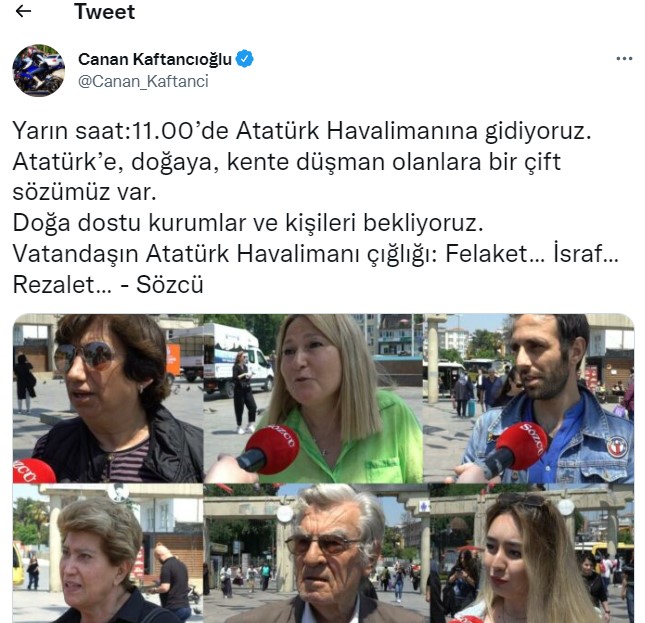 CHP İstanbul İl Başkanı Canan Kaftancıoğlu sosyal medya hesabından yaptığı son yıkılmasına başlanan Atatürk Havalimanı önünde buluşma çağrısı yaptı.