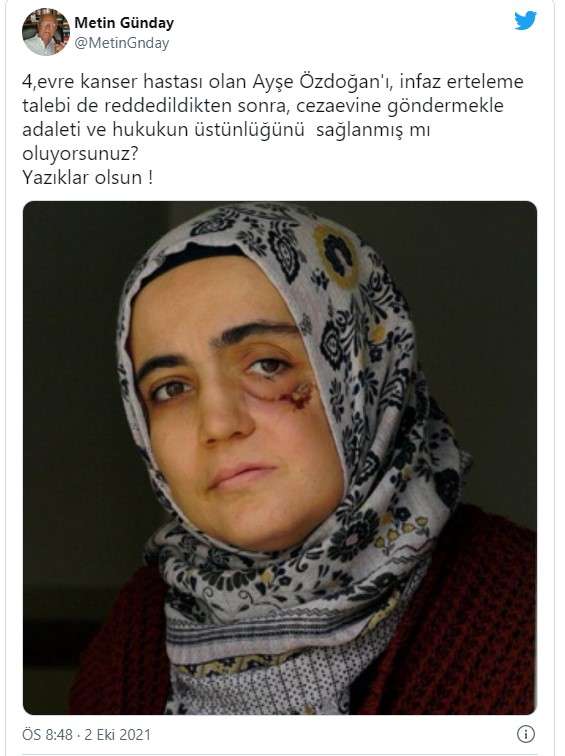 Ayşe Özdoğan’ın cezaevine gönderilmesi ile ilgili sosyal medya hesabından paylaşımda bulunan Türkiye’nin en önemli idare hukukçularından, Adalet Bakanı Abdülhamit Gül’ün de eski hocası olan Prof. Dr. Metin Günday, “4. evre kanser hastası olan Ayşe Özdoğan’ı, infaz erteleme talebi de reddedildikten sonra, cezaevine göndermekle adaleti ve hukukun üstünlüğünü sağlanmış mı oluyorsunuz? Yazıklar olsun!” dedi.