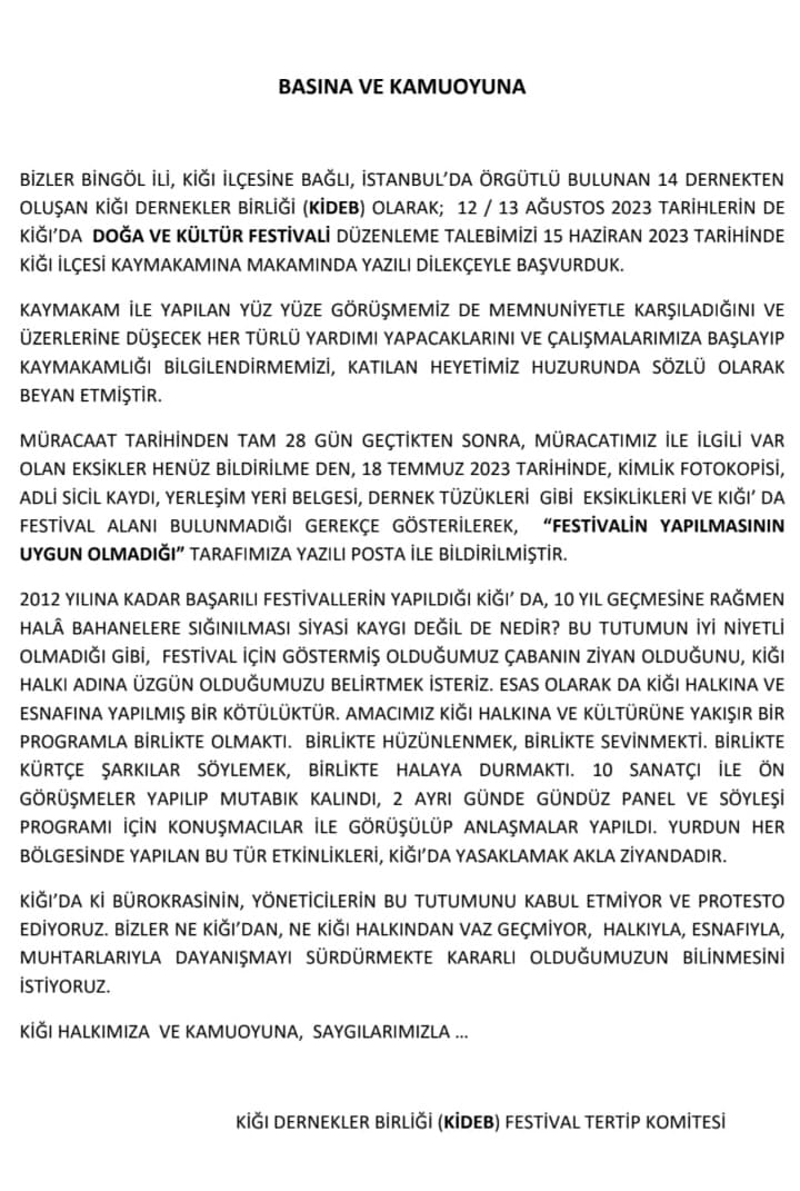 2012’ye kadar ilçede başarılı festı̇valler yapıldığını hatırlatan festival komitesi, “Bu tutumun ı̇yı̇ nı̇yetlı̇ olmadığı gı̇bı̇ festı̇val ı̇çı̇n göstermı̇ş olduğumuz çabanın ziyan olduğunu belirtmek ı̇sterı̇z. Esas olarak Kiğı halkına ve esnafına yapılmış bı̇r kötülüktür. Yurdun her bölgesı̇nde yapılan bu tür etkı̇nlı̇klerı̇ Kiğı’da yasaklamak akla zı̇yandır” dedi.