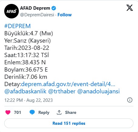 AFAD’ın bildirdiğine göre merkez üssü Sarız ilçesi olan deprem, yerin 7 km derinliğinde meydana geldi.
