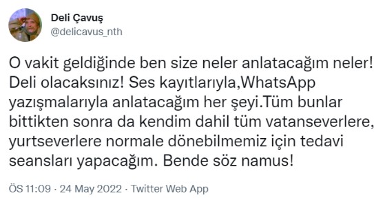 Deli olacaksınız! Ses kayıtlarıyla,WhatsApp yazışmalarıyla anlatacağım her şeyi.Tüm bunlar bittikten sonra da kendim dahil tüm vatanseverlere, yurtseverlere normale dönebilmemiz için tedavi seansları yapacağım. Bende söz namus!