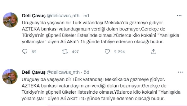 Uruguay'da yaşayan bir Türk vatandaşı Meksika'da gezmeye gidiyor. AZTEKA bankası vatandaşımızın verdiği doları bozmuyor.Gerekçe de Türkiye'nin şüpheli ülkeler listesinde olması.Yüzlerce kilo kokaini "Yanlışıkla yollamışlar" diyen Ali Akat'ı 15 günde tahliye edersen olacağı budur."