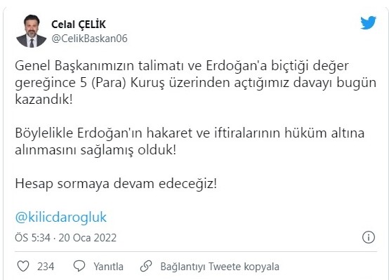 CHP Genel Başkanı Kemal Kılıçdaroğlu, Cumhurbaşkanı Recep Tayyip Erdoğan'a açtığı 5 kuruşluk hakaret davasını kazandı. CHP'nin avukatı Celal Çelik, "Hesap sormaya devam edeceğiz!" dedi.