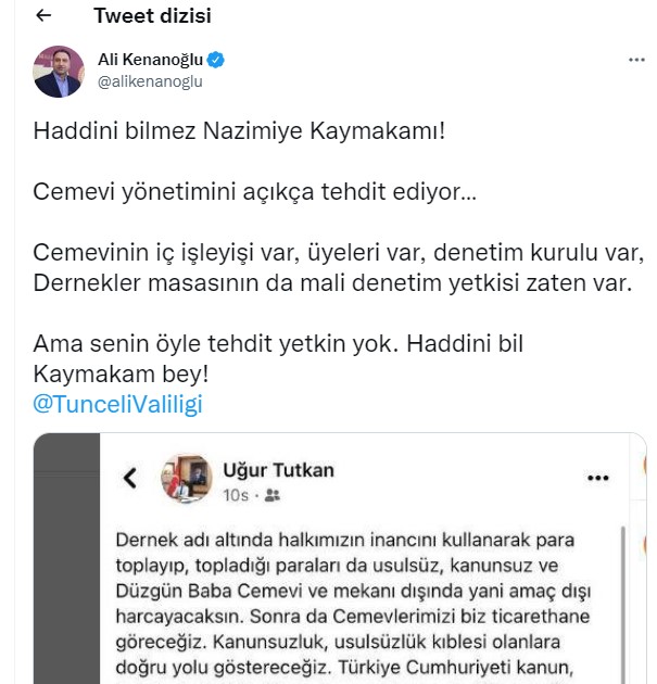 Söz konusu tehditle ilgili HDP İstanbul Milletvekili Ali Kenanoğlu, “Haddini bilmez Nazimiye Kaymakamı! Cemevi yönetimini açıkça tehdit ediyor. Cemevinin iç işleyişi var, üyeleri var, denetim kurulu var, Dernekler masasının da mali denetim yetkisi zaten var. Ama senin öyle tehdit yetkin yok. Haddini bil Kaymakam bey!” paylaşımını yaptı.