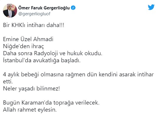 Gergerlioğlu, Twitter hesabından yaptığı paylaşımda, “Bir KHKlı intiharı daha!!!Emine Üzel Ahmadi. Niğde’den ihraç. Daha sonra radyoloji ve hukuk okudu. İstanbul’da avukatlığa başladı. 4 aylık bebeği olmasına rağmen dün kendini asarak intihar etti. Neler yaşadı bilinmez!” dedi.