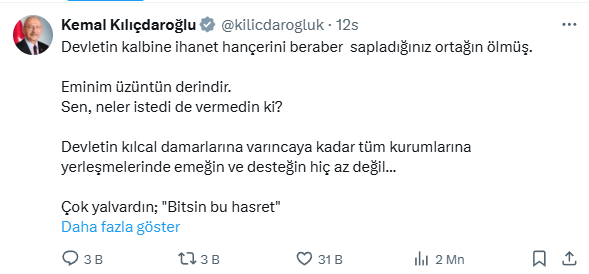“Ortağın vefat etmiş, üzüntün derindir!” diyen Kılıçdaroğlu, sosyal medya üzerinden şu ifadeleri kullandı: “Devletin kalbine ihanet hançerini beraber sapladığınız ortağın gitmiş. Eminim, bu durum seni derinden etkiliyor.