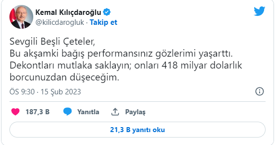 Cumhuriyet Halk Partisi (CHP) Genel Başkanı Kemal Kılıçdaroğlu sosyal medya hesabından beşli çeteleri hedef alarak, "Dekontları mutlaka saklayın; onları 418 milyar dolarlık borcunuzdan düşeceğim." dedi.