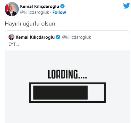 Tarih: 28-12-2022 22:57:16WELG | Kemal Kılıçdaroğlu, 18 Temmuz 2022’de yaptığı, "EYT... Loading (Yükleniyor)" paylaşımını hatırlatarak, "Hayırlı uğurlu olsun" ifadelerini kullandı.