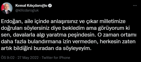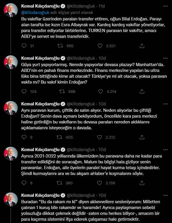 Sosyal medya hesabından paylaşım yapan CHP Lideri, ”Erdoğan, aile içinde anlaşırsınız ve çıkar milletimize doğruları söylersiniz diye bekledim ama görüyorum ki sen, davalarla algı yaratma peşindesin. O zaman ortamı daha fazla bulandırmana izin vermeden, herkesin zaten artık bildiğini buradan da söyleyeyim” diyerek Erdoğan ailesi ile söz konusu vakıflar arasındaki ilişkiyi açıkladı.