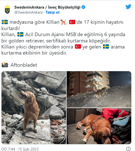 "İsveç medyasına göre Killian, Türkiye'de 17 kişinin hayatını kurtardı! Killian, İsveç Acil Durum Ajansı MSB'de eğitilmiş 6 yaşında bir golden retriever, sertifikalı kurtarma köpeğidir. Killian yıkıcı depremlerden sonra Türkiye'ye gelen arama kurtarma ekibinin bir üyesidir."