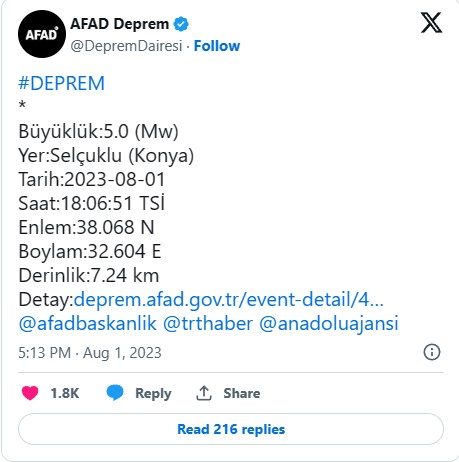 WELG | Afet ve Acil Durum Yönetimi (AFAD) Başkanlığının sitesinde yer alan bilgiye göre, merkez üssü Konya'nın Selçuklu ilçesi olan, saat 18.06'da 5 büyüklüğünde bir deprem meydana geldi.