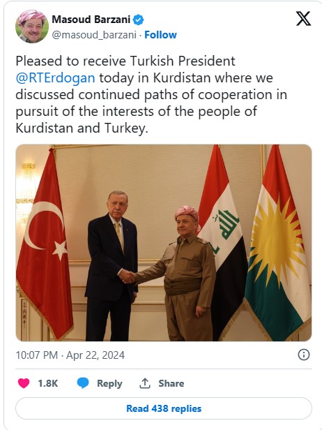 Tarih: 23-04-2024 08:19:24WELG | Barzani, sosyal medya hesabından yaptığı paylaşımda, Erdoğan'ı Kürdistan'da karşılamaktan duyduğu memnuniyeti dile getirdi. Türkiye ve Kürdistan'ın çıkarları doğrultusunda işbirliğinin önemine vurgu yaparak, görüşmenin olumlu geçtiğini belirtti.