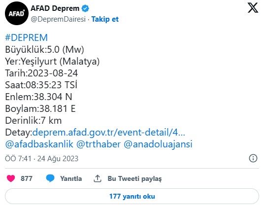 WELG | Afet ve Acil Durum Yönetimi Başkanlığı (AFAD) Deprem Dairesi Başkanlığı, Malatya'nın Yeşilyurt ilçesinde 5.0 büyüklüğünde bir deprem meydana geldiğini duyurdu.