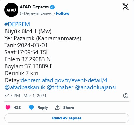 Tarih: 01-03-2024 20:02:36WELG | Afet ve Acil Durum Yönetimi Başkanlığı (AFAD) saat 17.09'da gerçekleşen depremin merkez üssünü Pazarcık olarak belirtti.