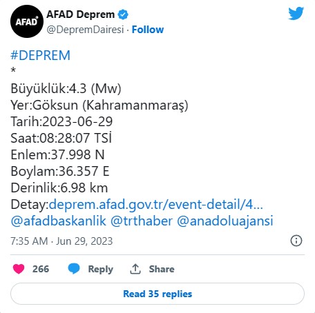 Maraş'ın Göksun ilçesinde, 4.3 büyüklüğünde deprem meydana geldi.