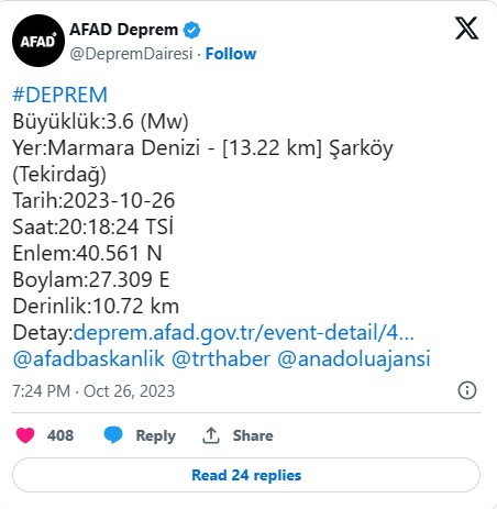 WELG | AFAD, Marmara Denizi'nde 3,6 büyüklüğünde deprem meydana geldiğini açıkladı.
