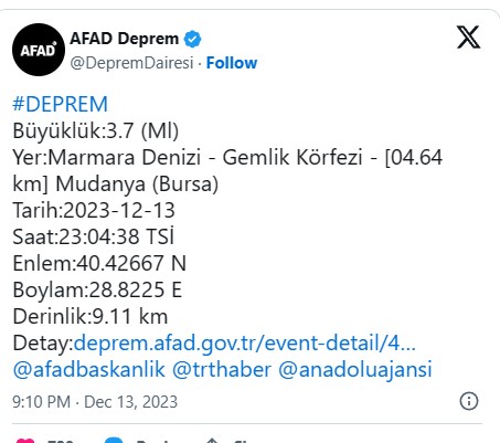 WELG | AFAD'ın verilerine göre, Marmara Denizi Gemlik Körfezi'nde 3,7 büyüklüğünde deprem meydana geldi.