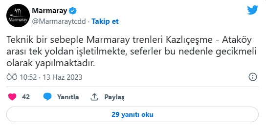 Ancak, daha sonra söz konusu paylaşım silinerek “Teknik bir sebeple Marmaray trenleri Kazlıçeşme - Ataköy arası tek yoldan işletilmekte, seferler bu nedenle gecikmeli olarak yapılmaktadır” açıklaması yapıldı.