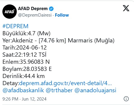 WELG | Marmaris'e 74 kilometre mesafede meydana gelen deprem, Muğla'nın yanı sıra Aydın, İzmir ve Denizli'de de hissedildi. Depremin merkez üssü Yunanistan'ın Rodos Adası'na çok yakın bir noktada bulunuyor.