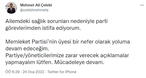 WELG - Twitter üzerinden bir açıklama yapan Memleket Partisi Genel Başkan Yardımcısı Mehmet Ali Çelebi, "Ailemdeki sağlık sorunları nedeniyle parti görevlerimden istifa ediyorum. Memleket Partisi’nin üyesi bir nefer olarak yoluma devam edeceğim.