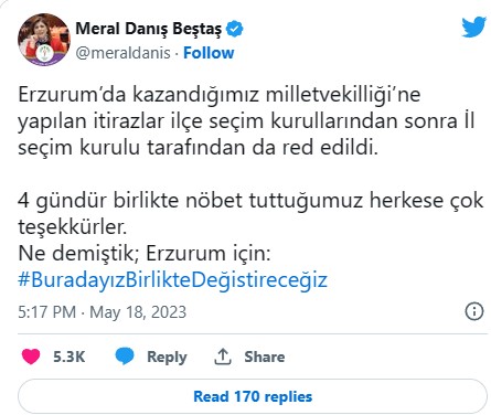 "Erzurum’da kazandığımız milletvekilliği’ne yapılan itirazlar ilçe seçim kurullarından sonra il seçim kurulu tarafından da red edildi. 4 gündür birlikte nöbet tuttuğumuz herkese çok teşekkürler.