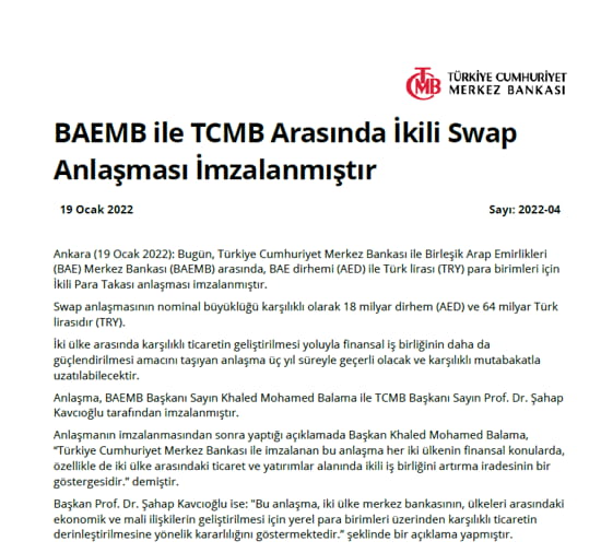 Tarih: 19-01-2022 10:33:28 Güncelleme: 19-01-2022 11:56:28WELG - Türkiye Cumhuriyet Merkez Bankası ile Birleşik Arap Emirlikleri (BAE) Merkez Bankası (BAEMB) arasında, BAE dirhemi (AED) ile Türk lirası (TRY) para birimleri için İkili Para Takası anlaşması imzalandı. Swap anlaşmasının nominal büyüklüğü karşılıklı olarak 18 milyar dirhem (AED) ve 64 milyar Türk lirası oldu. Anlaşma 3 yıl olarak imzalandı ve karşılıklı mutabakatla uzatılabilecek.