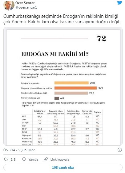 Sencar sonuçları “Cumhurbaşkanlığı seçiminde Erdoğan’ın rakibinin kimliği çok önemli. Rakibi kim olsa kazanır varsayımı doğru değil” sözleriyle değerlendirdi.