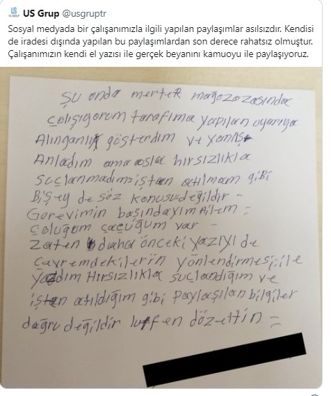 “Bugün yayılmaya uğraşılan asılsız haberler de bir kez daha göstermiştir ki, Migros maksatlı olarak kötü niyetli bir sürecin tarafı yapılmaya çalışılmaktadır. Us Grup tarafından olay titizlikle incelenmiş ve ekli açıklama yapılmıştır. Bahsi geçen çalışan, temizlik elemanı olarak Merter mağazamızda çalışmaya devam etmekte olup, daha önce kendisi tarafından yapıldığı belirtilen açıklamanın tamamen başkaları tarafından yönlendirilerek yazıldığını, paylaşımların kendi iradesi dışında yapıldığını ifade etmiştir.”