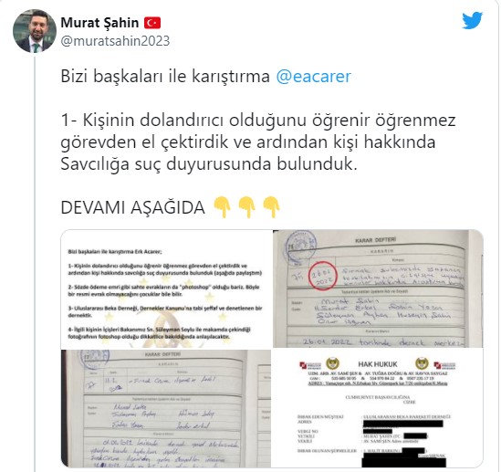Acarer’in iddialarına Murat Şahin Twitter’dan yanıt verdi. “Bizi başkaları ile karıştırma Erk Acarer” diyen Şahin, “Kişinin dolandırıcı olduğunu öğrenir öğrenmez görevden el çektirdik ve ardından kişi hakkında Savcılığa suç duyurusunda bulunduk” bilgisini verdi.