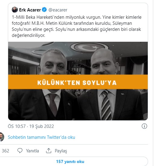 7- Dolandırıcılık yapan, devletin örtülü şekilde derneğe para aktardığını evraklar ile gösteren Milli Beka Hareketi Cizre Başkanı ve Süleyman Soylu! Birden çok kez yan yana. Kolay gelsin!” (Tweetler Acarer’in yazdığı şekilde aktarılmış, herhangi bir editöryal müdahalede bulunulmamıştır.)