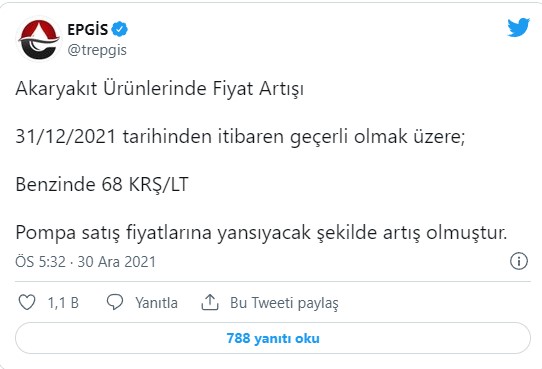 Enerji Petrol Gaz İkmal İstasyonları İşveren Sendikası (EPGİS), yapılan zammı sosyal medya hesabından böyle duyurdu: