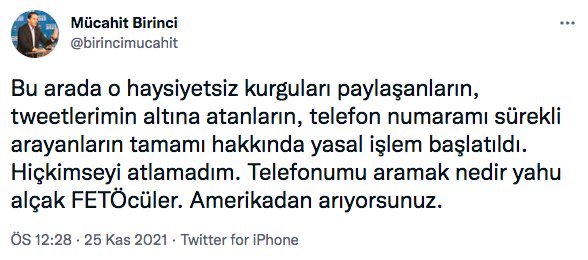 Kendisine ait olduğu öne sürülen WhatsApp mesajları için “iftira” diyen Birinci, attığı tweet’te “Bu haysiyetsiz alçakların hakkımızda yaptıkları tamamen iftira niteliğindeki uydurma haysiyet cellatlığının hesabını verecekler ifadesini kullandı.