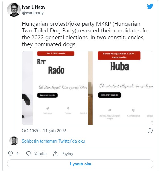 Facebook'ta geniş bir kitle kazanan İki Kuyruklu Köpek Partisi (MKKP), Orban’a karşı bulldog cinsi Huba ve labrador cinsi Rado'yu aday gösterdi.