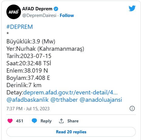 WELG | Afet ve Acil Durum Yönetimi Başkanlığından (AFAD) alınan bilgiye göre, saat 20.32'de Maraş’ın Nurhak ilçesinde 3.9 büyüklüğünde deprem meydana geldi.